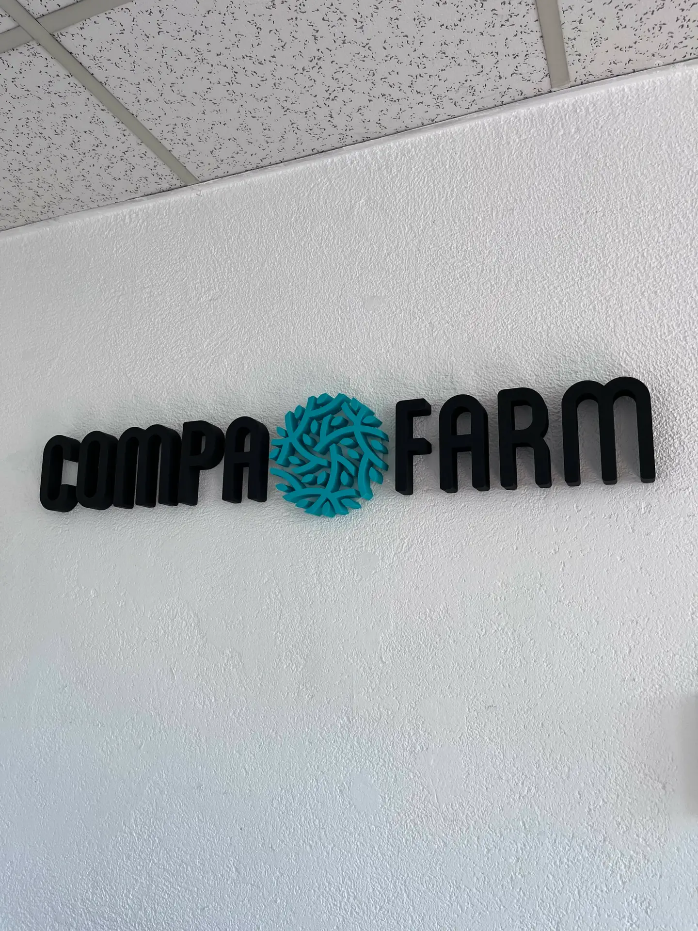 Für CompaFarm entstand ein modernes 3D-gedrucktes Wandlogo, bei dem das farbige grafische Element gezielt Akzente setzt und die Firmenidentität unterstreicht.
